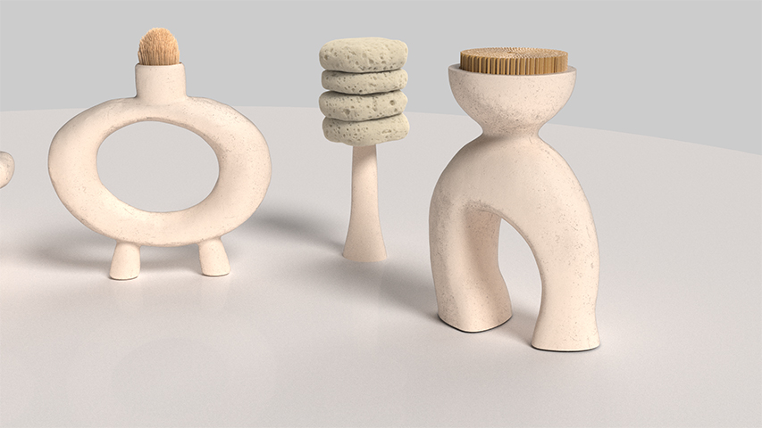 We reflected on different means of applying and feeling soap on the skin using several tools such as: brush, sponge, sustainably sourced rubber. The palette offers different soap properties, highlighting: hydrating, exfoliating, and scrubbing.